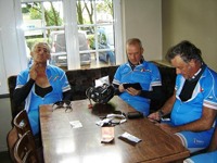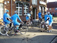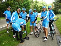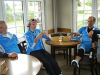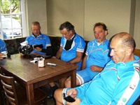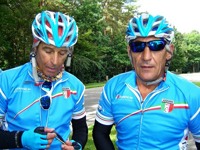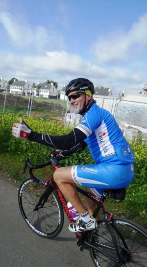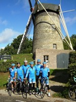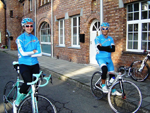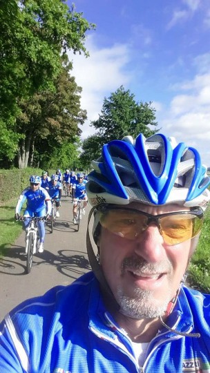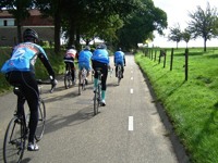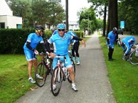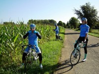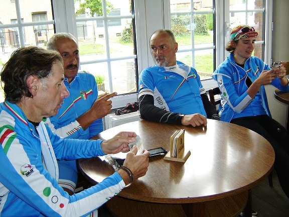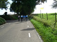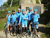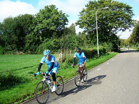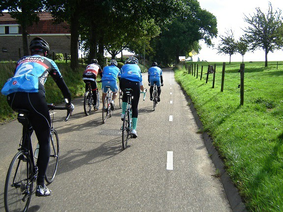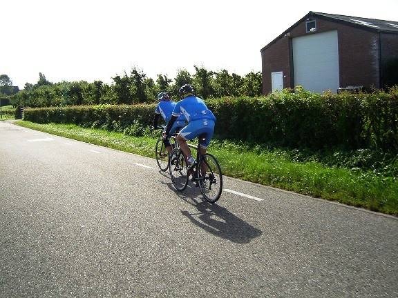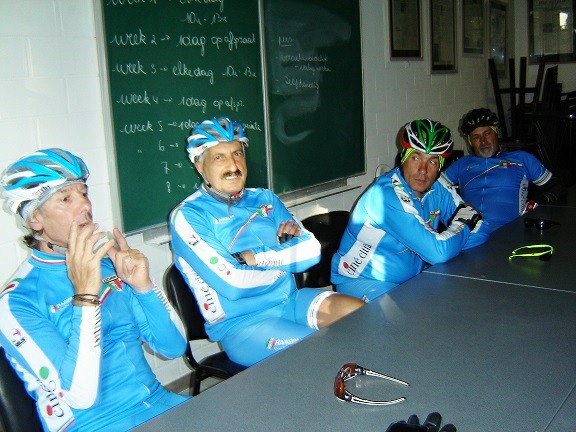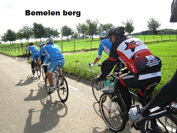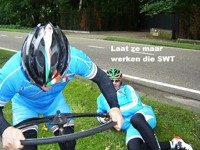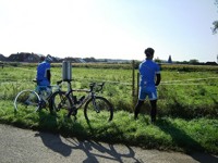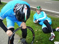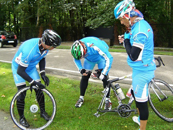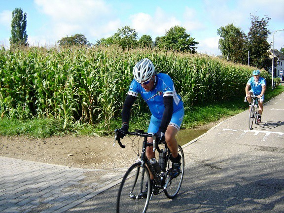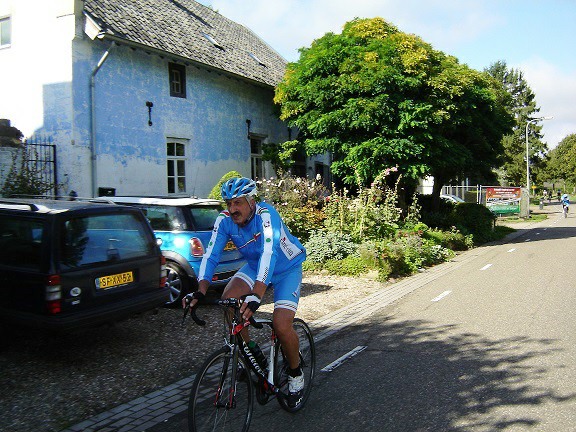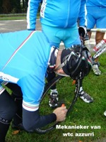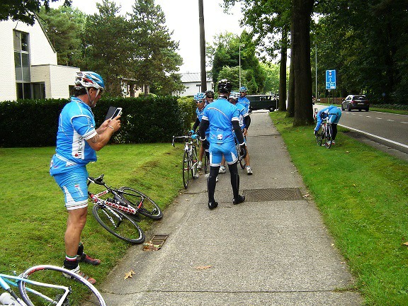 De rit werd verder gezet richting Valkenburg, nog enkele klimmetjes en zo naar Beek. Op weg naar Maasmechelen aan de voet van de Salamander reed Franco lek; moet lukken dat dit juist op dezelfde plek was waar hij vorige keer pech had. Maar goed dat onze fietsmechanieker van dienst Tonino erbij was en de nodige hulp bood, terwijl het slachtoffer languit in het malse gras genoot van de zonnestraaltjes. Dit heet verwennerij bij wtc Azzurri !! Maar nu toch maar huiswaarts rijden en in de verte zien we Donato koprijden, een goeie 50 meter voorop maar wel de verkeerde kant uit. Hij wordt teruggefloten en zo kunnen we veilig terug rijden naar Genk. Charlotte behaalde vandaag de bolletjestrui; proficiat!