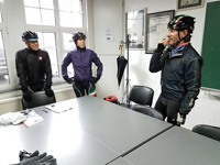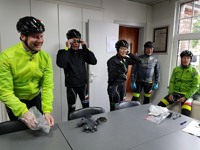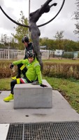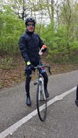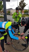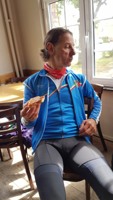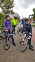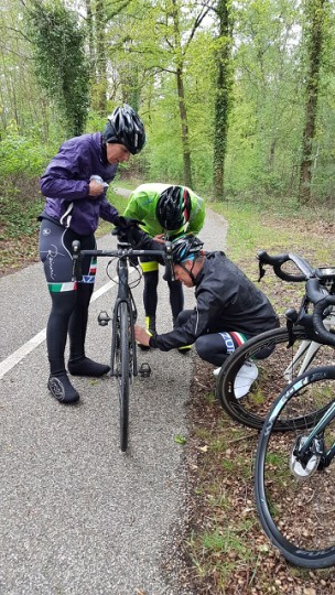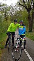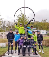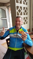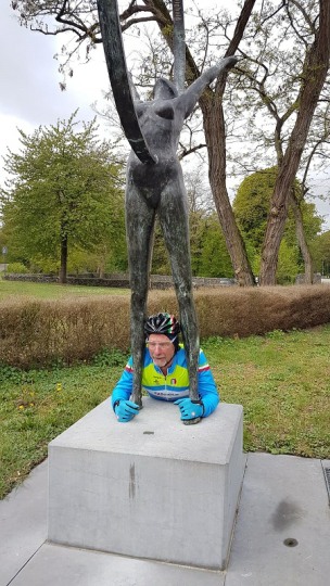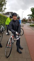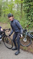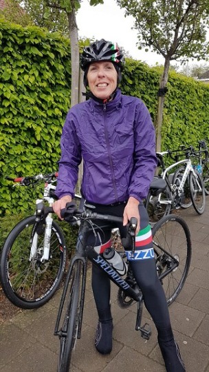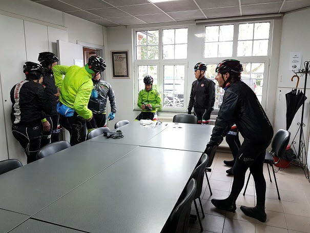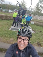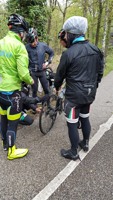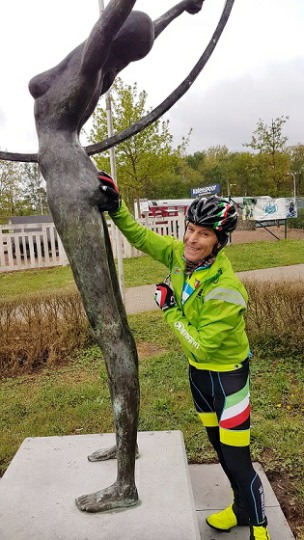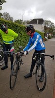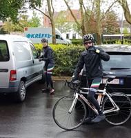 Baankapitein Emidio, voorzien van modern regenkapje om zijn krullen in de plooi te houden, leidde de groep richting As maar hier moesten we al een eerste stop houden want Conny had lek gereden. Nadien werd de rit verder gezet naar Maasmechelen en dan richting Valkenburg. Het centrum werd links gelaten en we fietsten zo naar Meerssen waar we de Slingerberg opreden. Onze roze trui-drager Walter was hier als snelste boven. Conny kon al goed mee met haar koersfietske… dikke pluim hiervoor.