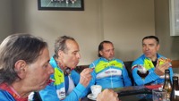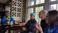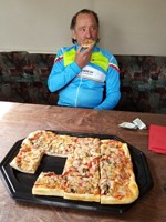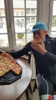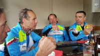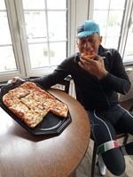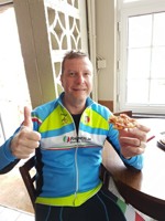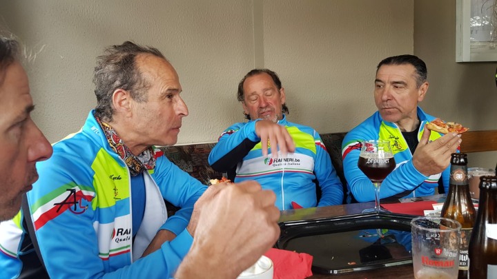 Zoals de weergoden voorspeld hadden, was het in Nederland heel mooi weer en de regenjassen werden snel weggeborgen. Ook de badmuts van Emidio belandde in de achterzak. Nu terug huiswaarts via de Salamander, As en zo naar ons clublokaal waar de uitbaters ons trakteerden op lekkere zelfgemaakte pizza. Er werd zoals altijd goed gelachen en van alles verteld maar we misten toch de straffe verhalen van onze kampioen Franco, die momenteel geniet van een heerlijke vakantie!