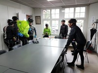 Miezerig weer bij de start vanmorgen voor de rit naar de Slingerberg in Nederland, maar iedereen was voorzien van regenkledij.
