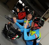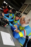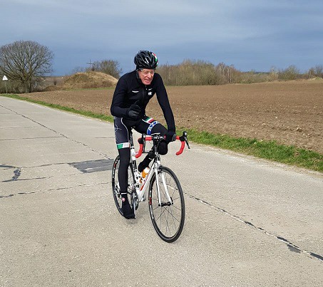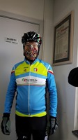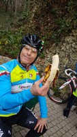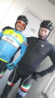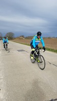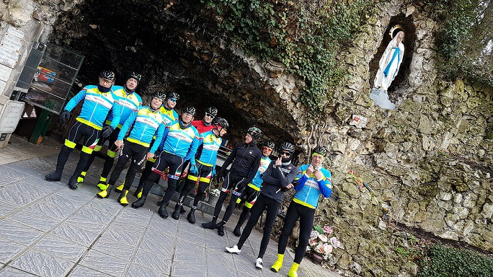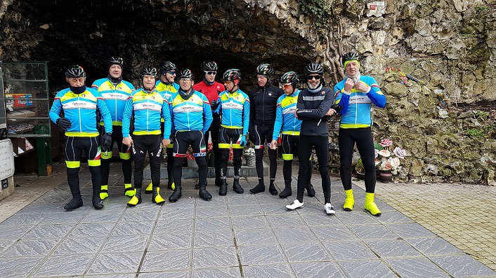 Er stond een stevige wind en de elf Azzurri’s moesten stevig op de trappers staan om enige snelheid te halen. Gelukkig ging het daarna in dalende lijn naar de grot waar er werd gestopt voor de groepsfoto.